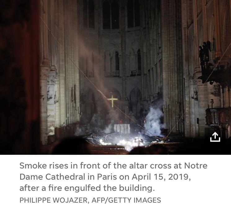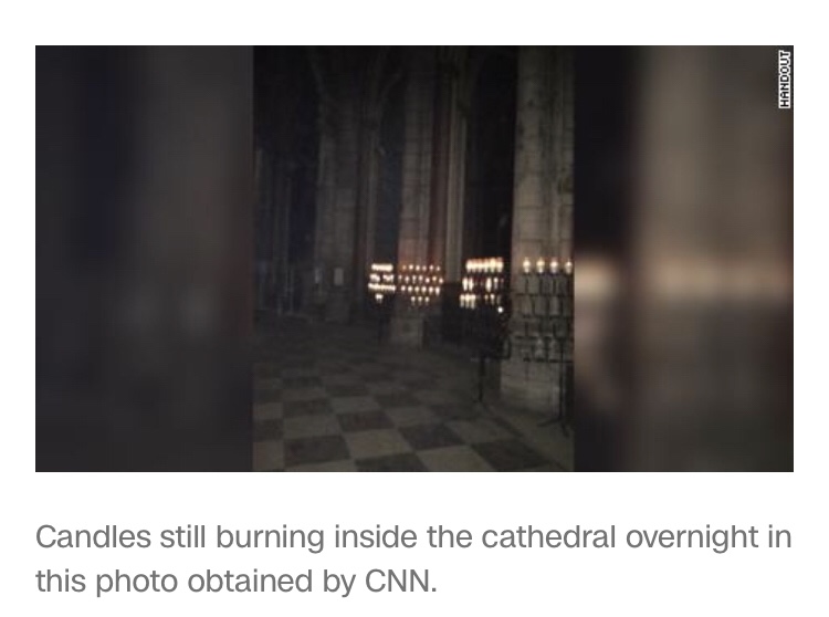 • “The cathedral’s golden altar cross was seen standing as officials surveyed the charred structure. Votive candles lit prior to the blaze — each one symbolizing a prayer — still flickered undisturbed in the cathedral,” CNN reported.